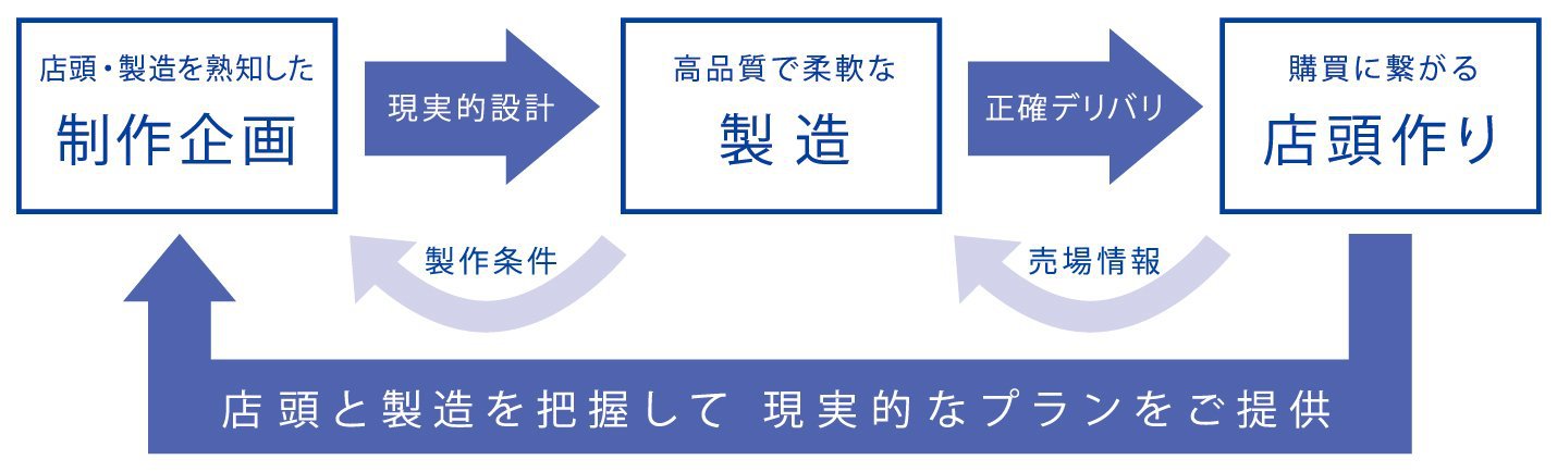 スケジュール管理や見積り調整。複数のサプライヤーへの説明。見本、校正がばらばらにくる・・・など、店頭販促の担当者は、次から次へと時間に追われているのではないでしょうか。そんな「大変」を当社は「ワンストップ」でお手伝いします。 選択するのはあくまでお客様です。当社は、ワンストップを目指した働きを心がけます。 そして、ご信頼を頂戴できるように、お客様理解とお客様価値の向上に一生懸命努めます。