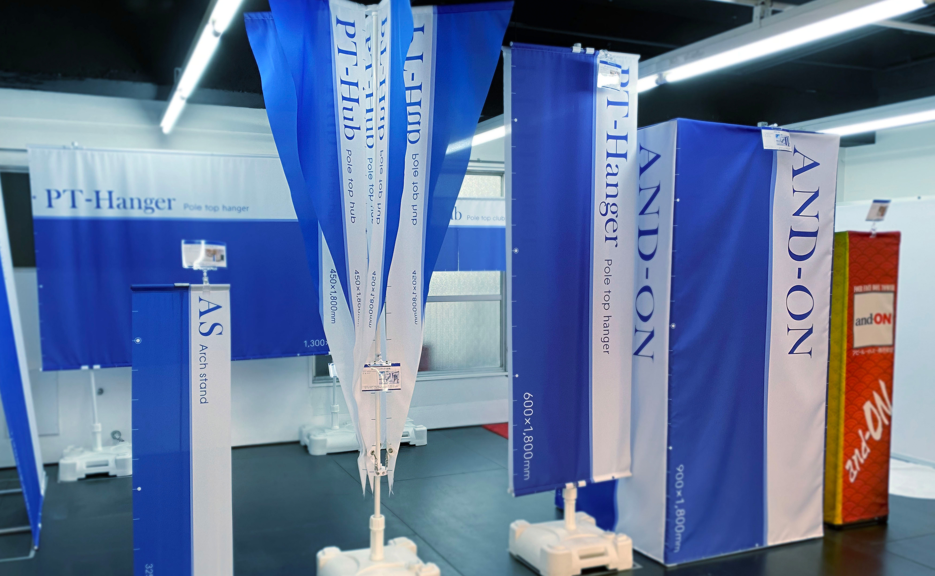 当社オリジナル製品で、多面告知が可能な「ポールトップ・ハブ」、カンザシ部分の突き出しが無くスタイリッシュな「楽っ!とポール」、筒状でインパクトのあるバナースタンド「AND-ON」など、他社ではあまり見かけない独自製品を数多く展示しています。
