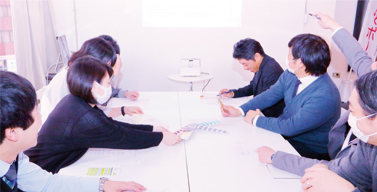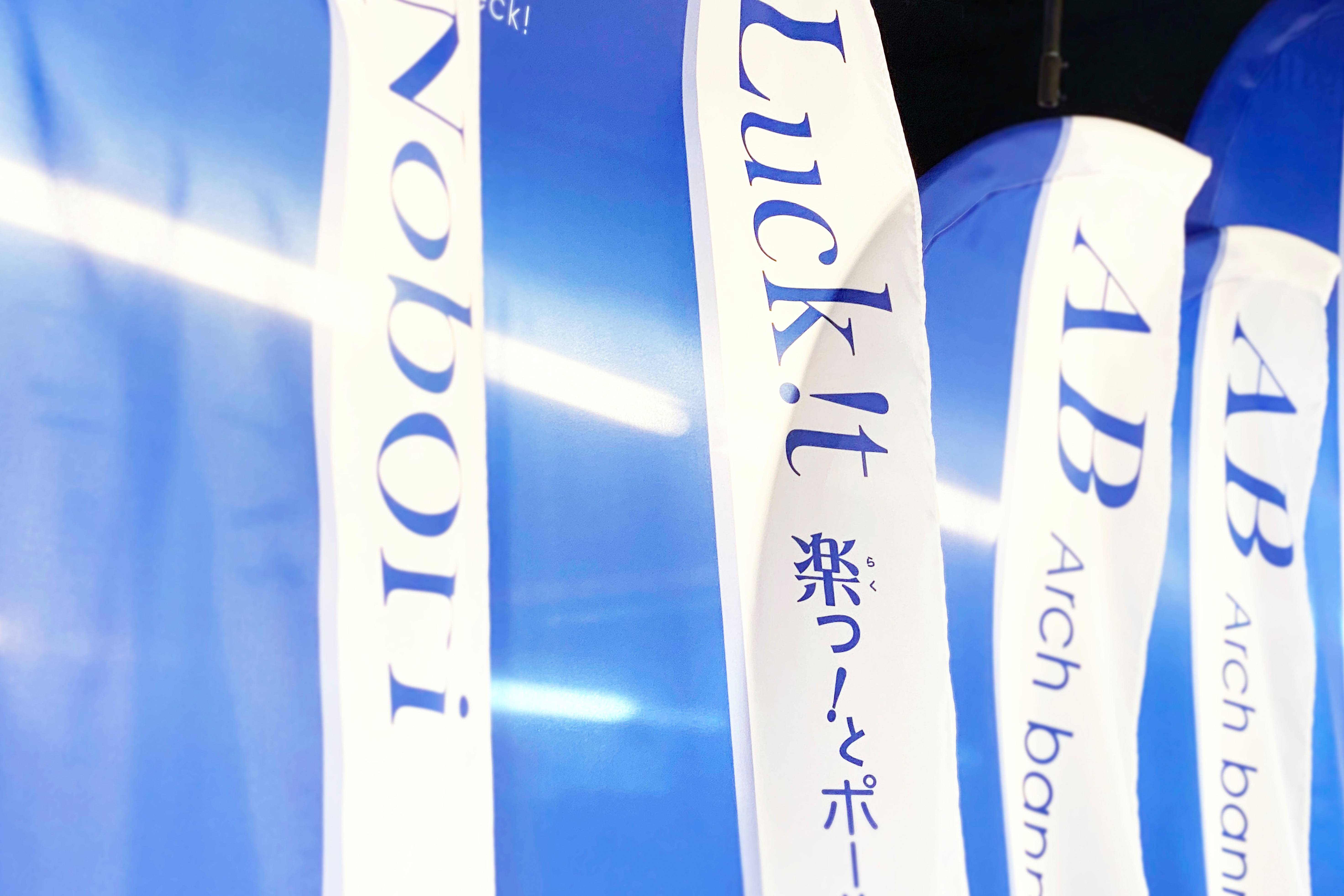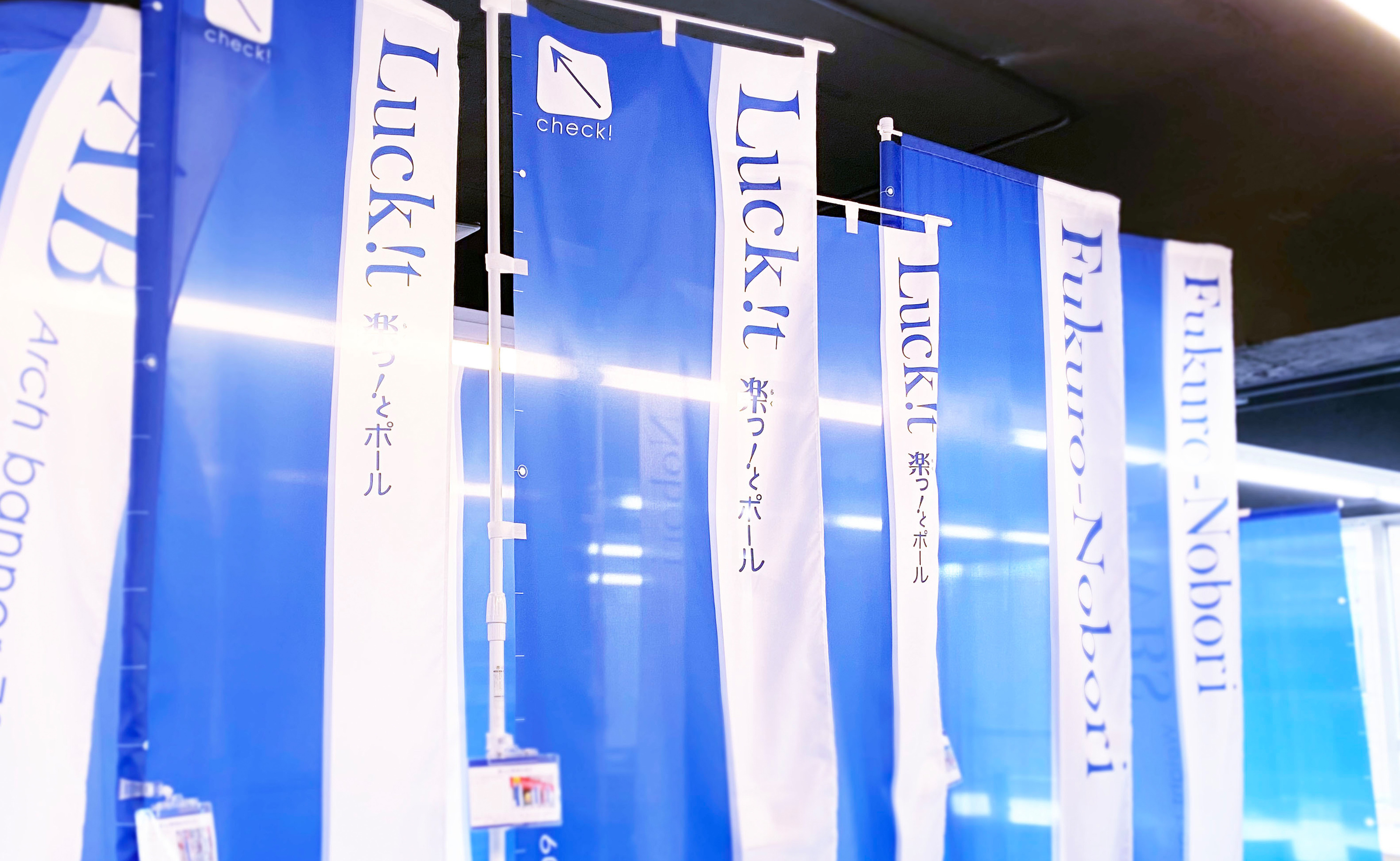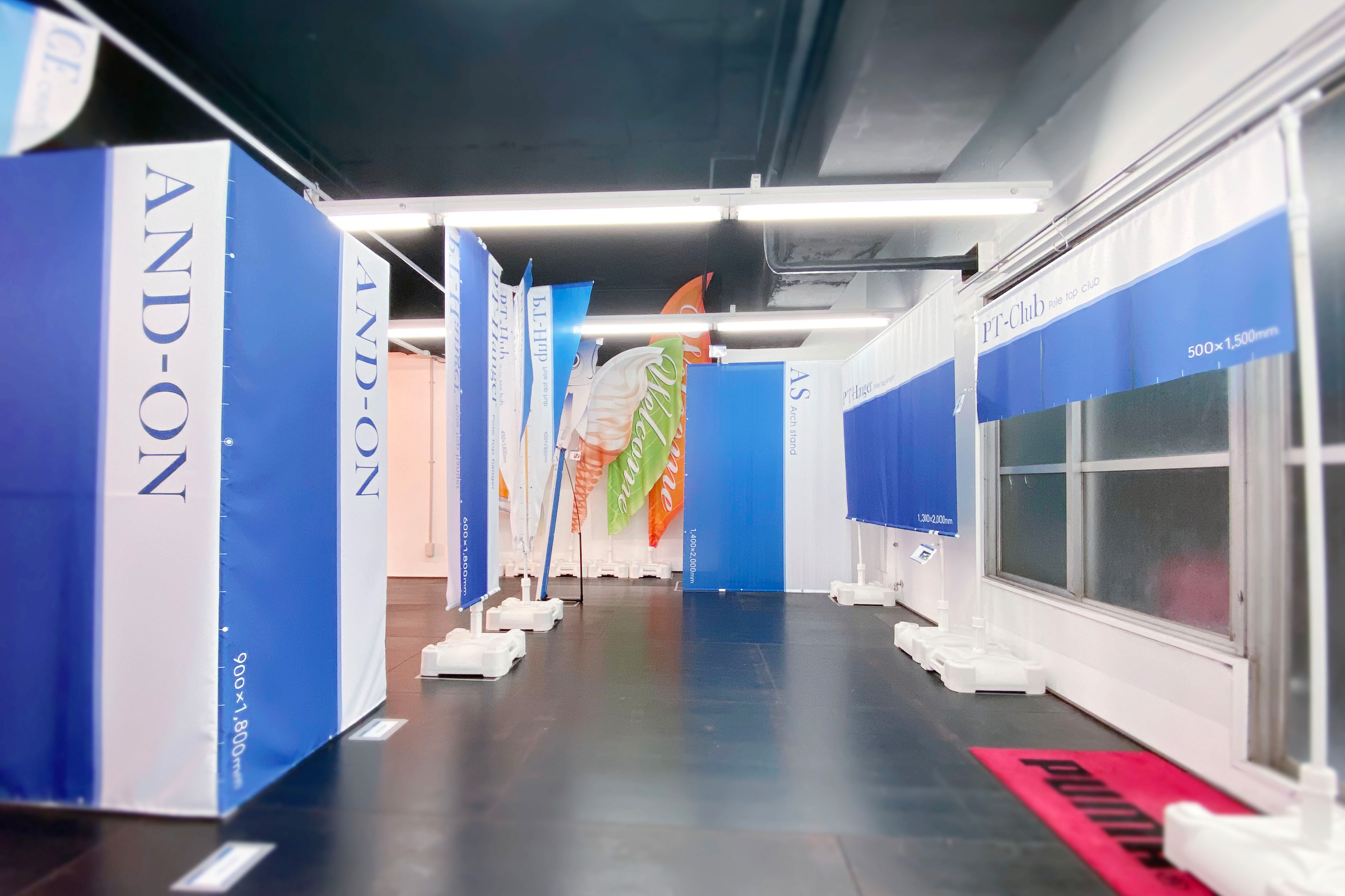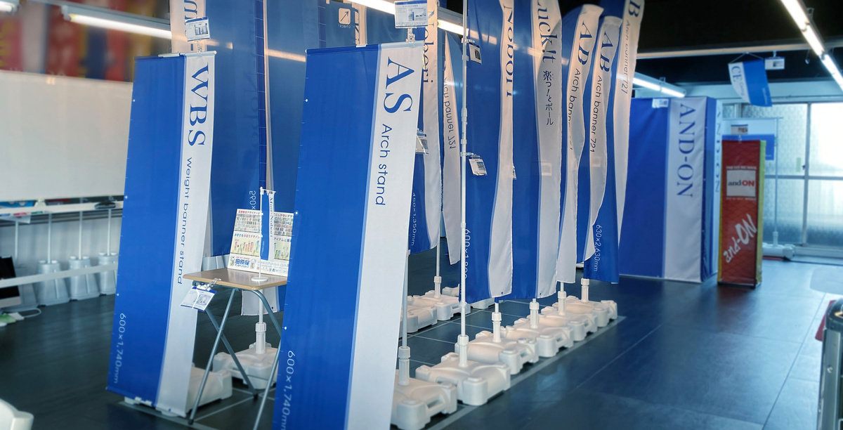 街中でよく見かける「のぼり」の各種サイズはもちろん、卓上タイプの「ミニのぼり」、吸盤タイプの「ウインドウフラッグ」など、店舗に必須なツールをひととおり展示しています。