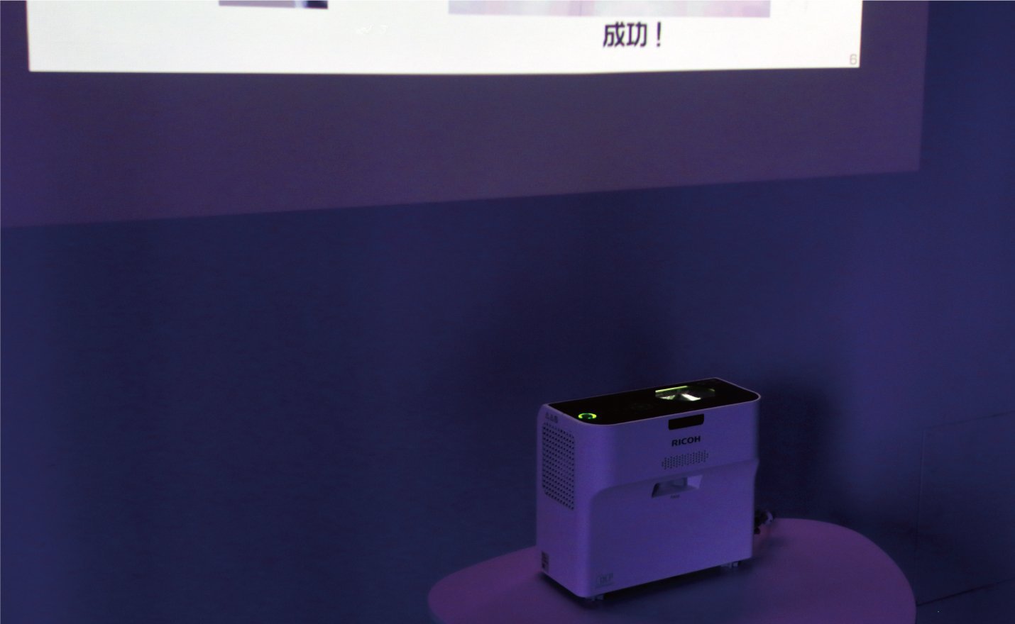 デジタルサイネージ化との融合を見据え、RICOH製の超短焦点プロジェクターを導入しました。壁からわずか11.7cmの超至近投影と軽量コンパクトが特徴です。