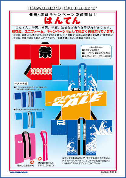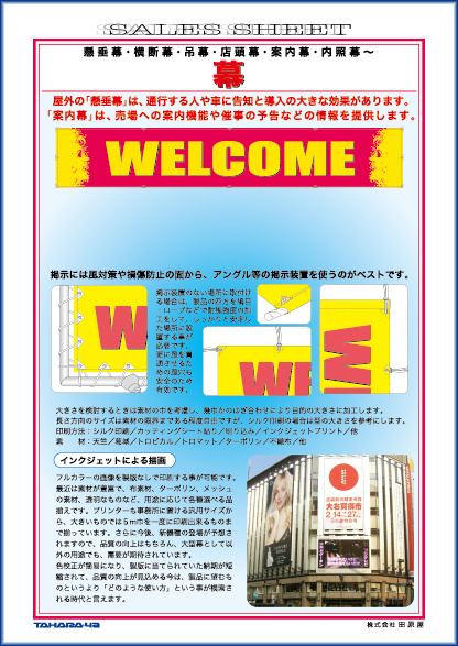 のぼり(幟) のぼり旗・陣旗・桃太郎旗・その他、様々な呼称があり、店頭に活気を与えます。「のぼりがあれば商売できる」といっても過言ではありません。 PDFを開く(179KB) 幕 幕には、懸垂幕・横断幕・吊り幕等の種類があります。例えば「懸垂幕」は、通行する人や車に告知と導入といった大きな効果があります。 PDFを開く(365KB) のれん(暖簾) のれんは、古来からお店の顔で、現代では販促物として受け継がれています。使う場所によって、屋号や強調製品をアピールするなど使い分けができます。 PDFを開く(303KB) 旗 旗には、団体旗・応援旗・国旗などの種類があり、会社や団体等の象徴としての役割があります。一般的に式典等に使われる高級旗と、常用する略旗などに使い分けされています。 PDFを開く(422KB) はんてん はんてんは、お祭り・催事・店頭キャンペーン等の必需品です。半天・半纏・法被等の色々な呼称があります。 PDFを開く(223KB) ※仕様は予告なく変更することがあります。※無断転用及び再利用は禁じます。