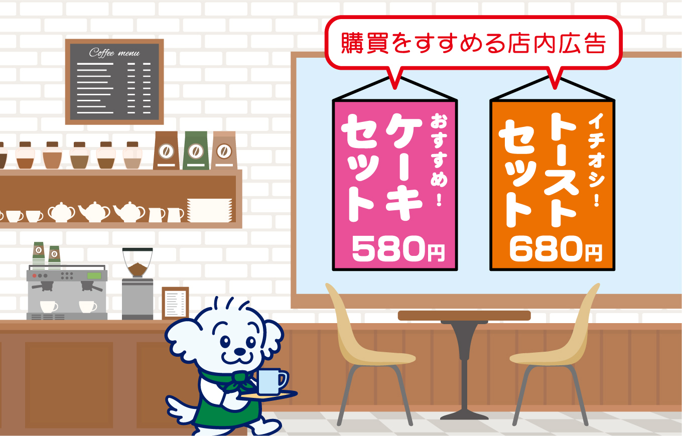 購買をすすめる店内広告では「ケーキセット580円」などと平均単価が少し高い商品を謳う、