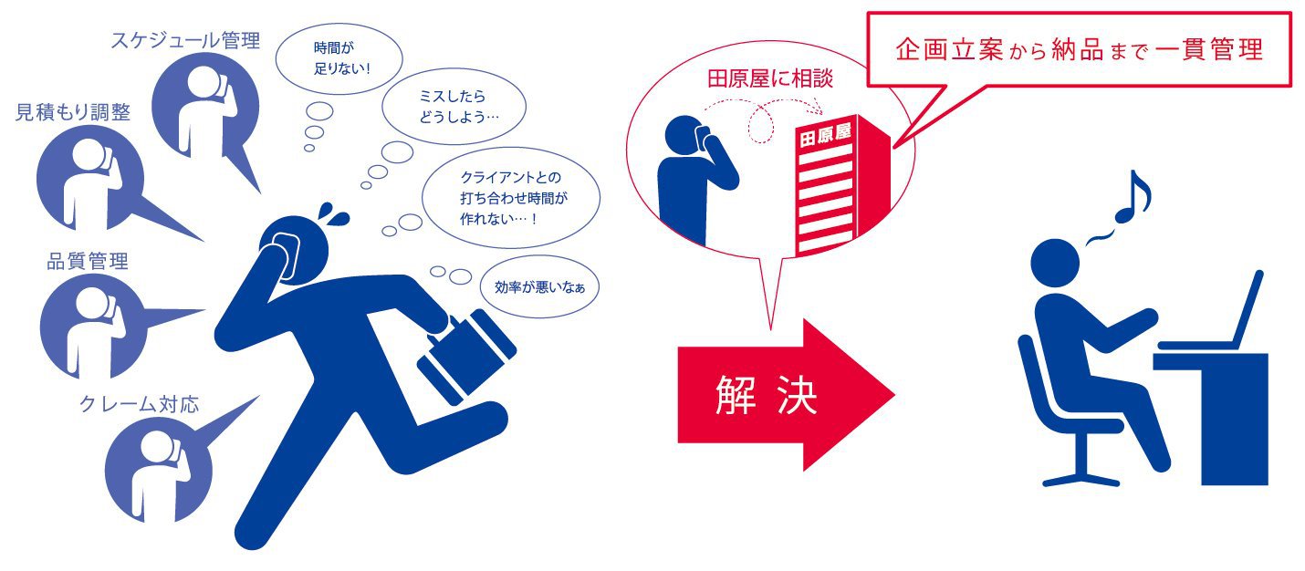 スケジュール管理や見積り調整。複数のサプライヤーへの説明。見本、校正がばらばらにくる・・・など、店頭販促の担当者は、次から次へと時間に追われているのではないでしょうか。そんな「大変」を当社は「ワンストップ」でお手伝いします。 選択するのはあくまでお客様です。当社は、ワンストップを目指した働きを心がけます。 そして、ご信頼を頂戴できるように、お客様理解とお客様価値の向上に一生懸命努めます。
