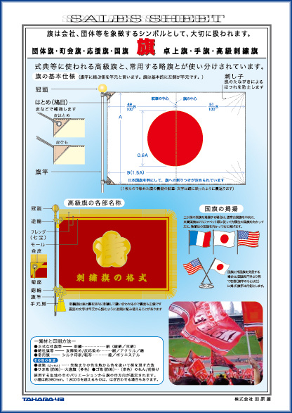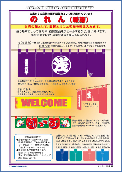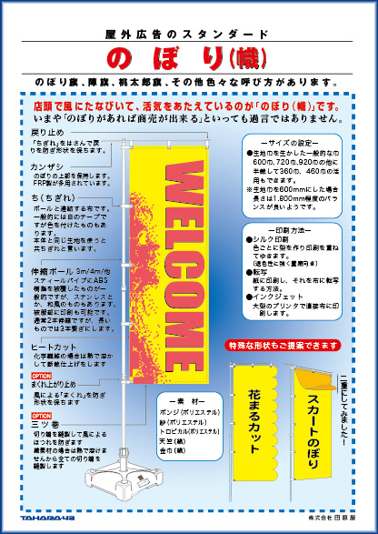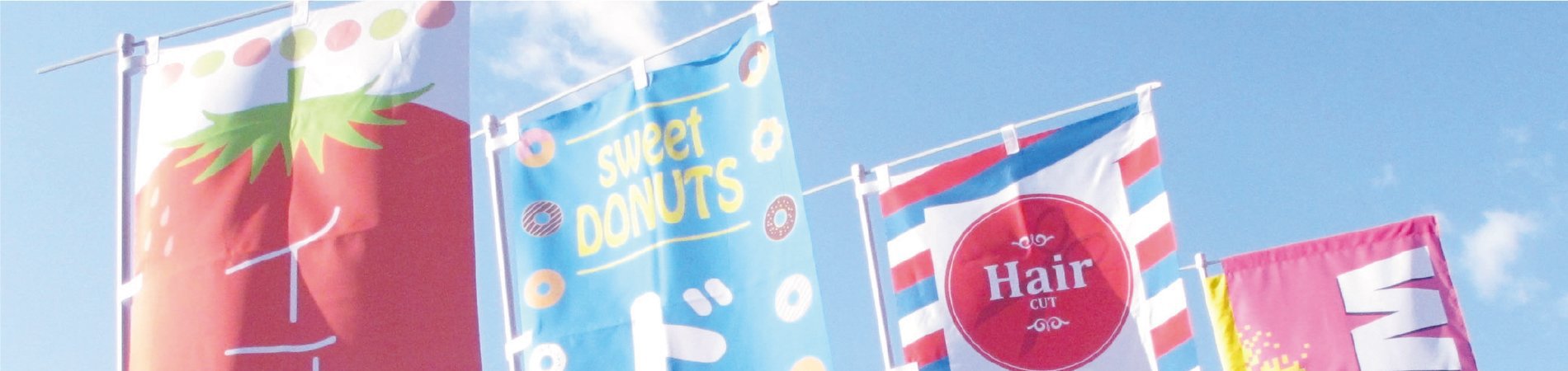 のぼり(幟) のぼり旗・陣旗・桃太郎旗・その他、様々な呼称があり、店頭に活気を与えます。「のぼりがあれば商売できる」といっても過言ではありません。 PDFを開く(179KB) 幕 幕には、懸垂幕・横断幕・吊り幕等の種類があります。例えば「懸垂幕」は、通行する人や車に告知と導入といった大きな効果があります。 PDFを開く(365KB) のれん(暖簾) のれんは、古来からお店の顔で、現代では販促物として受け継がれています。使う場所によって、屋号や強調製品をアピールするなど使い分けができます。 PDFを開く(303KB) 旗 旗には、団体旗・応援旗・国旗などの種類があり、会社や団体等の象徴としての役割があります。一般的に式典等に使われる高級旗と、常用する略旗などに使い分けされています。 PDFを開く(422KB) はんてん はんてんは、お祭り・催事・店頭キャンペーン等の必需品です。半天・半纏・法被等の色々な呼称があります。 PDFを開く(223KB) ※仕様は予告なく変更することがあります。※無断転用及び再利用は禁じます。